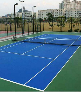 一片标准网球场地的占地面积不小于36.6米(南北长)×18.3(东西宽)米,这一尺寸也是一片标准网球场地四周围挡网或室内建筑内墙面的净尺寸。在这个面积内,有效双打场地的标准尺寸是:23.77米(长)×10.98米(宽),在每条端线后应留有余地不小于6.40米,在每条边线外应流有余地不小于3.66米。在球场安装网柱,两柱中心测量,柱间距是12.80米,网柱顶端距地面是0.914米。