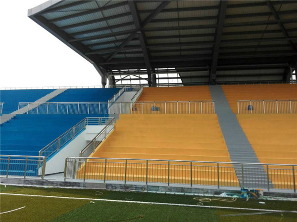 体育场看台地坪建议采用硬地丙烯酸材料,水性原料,无毒100%绿色环保产品,色彩鲜艳,不易老化,使用寿命长,耐候性好,颜色持久不褪,极佳的耐磨性、防滑性好,可提供多种颜色供