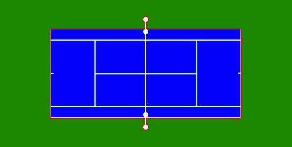 一片标准网球场地的占地面积不小于36.6米(南北长)×18.3(东西宽)米,这一尺寸也是一片标准网球场地四周围挡网或室内建筑内墙面的净尺寸。在这个面积内,有效双打场地的标准尺寸是:23.77米(长)×10.98米(宽),在每条端线后应留有余地不小于6.40米,在每条边线外应流有余地不小于3.66米。在球场安装网柱,两柱中心测量,柱间距是12.80米,网柱顶端距地面是0.914米。