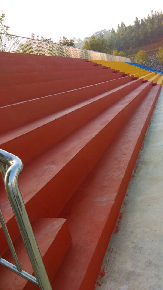 体育场看台地坪建议采用硬地丙烯酸材料,水性原料,无毒100%绿色环保产品,色彩鲜艳,不易老化,使用寿命长,耐候性好,颜色持久不褪,极佳的耐磨性、防滑性好,可提供多种颜色供