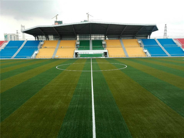 体育场看台地坪建议采用硬地丙烯酸材料,水性原料,无毒100%绿色环保产品,色彩鲜艳,不易老化,使用寿命长,耐候性好,颜色持久不褪,极佳的耐磨性、防滑性好,可提供多种颜色供