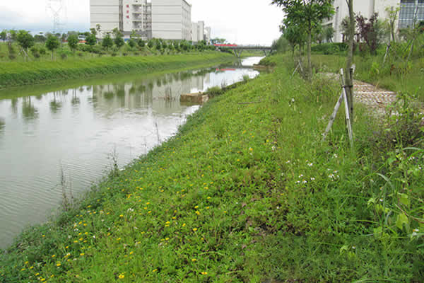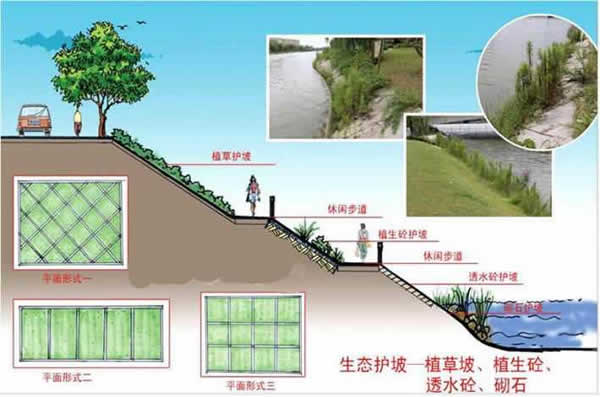植生生态混凝土护坡技术是将混凝土集料与生态护坡专用外加剂进行适当配比和现场浇注,形成可植生态绿化的完整的生态护坡体系。具有高强度、大孔隙率、结构稳定、抗冻融型好、有效的抑制堆土流失的性能特点,又能适应多种植生方式,绿化覆盖率达到95%以上,改善生态环境和景观,可实现长期持续性生态护坡。